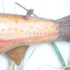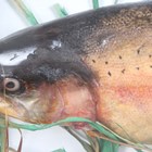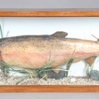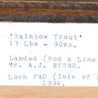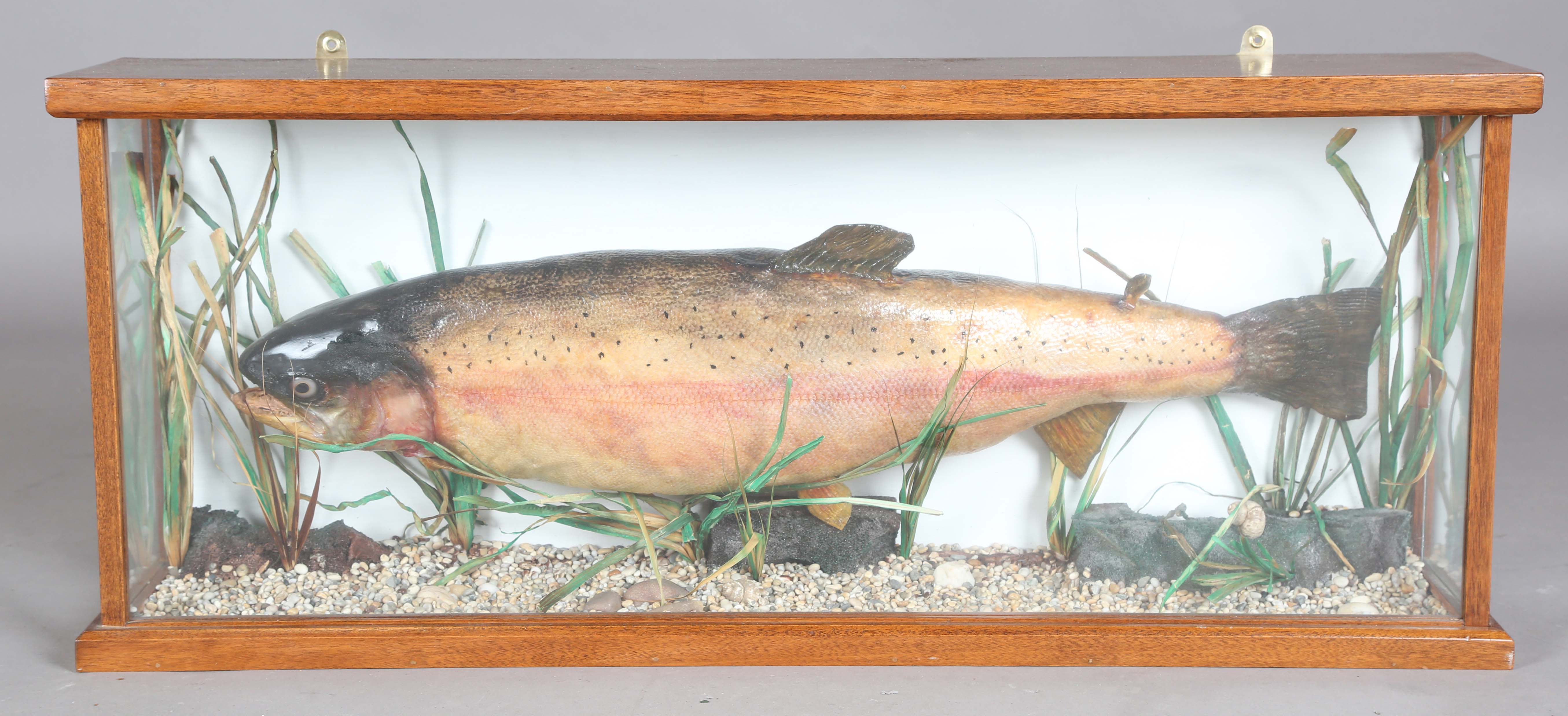 A late 20th century taxidermy specimen of a rainbow trout, the stuffed fish mounted within a wooden glazed case, the reverse bearing label detailed 'Rainbow Trout 13lbs-9ozs Landed (Rod & Line) by Mr A.J. Byrne. Loch FAD (Isle of Bute) 1994', height 35.5cm, width 86cm.