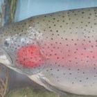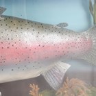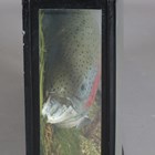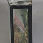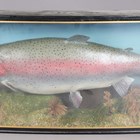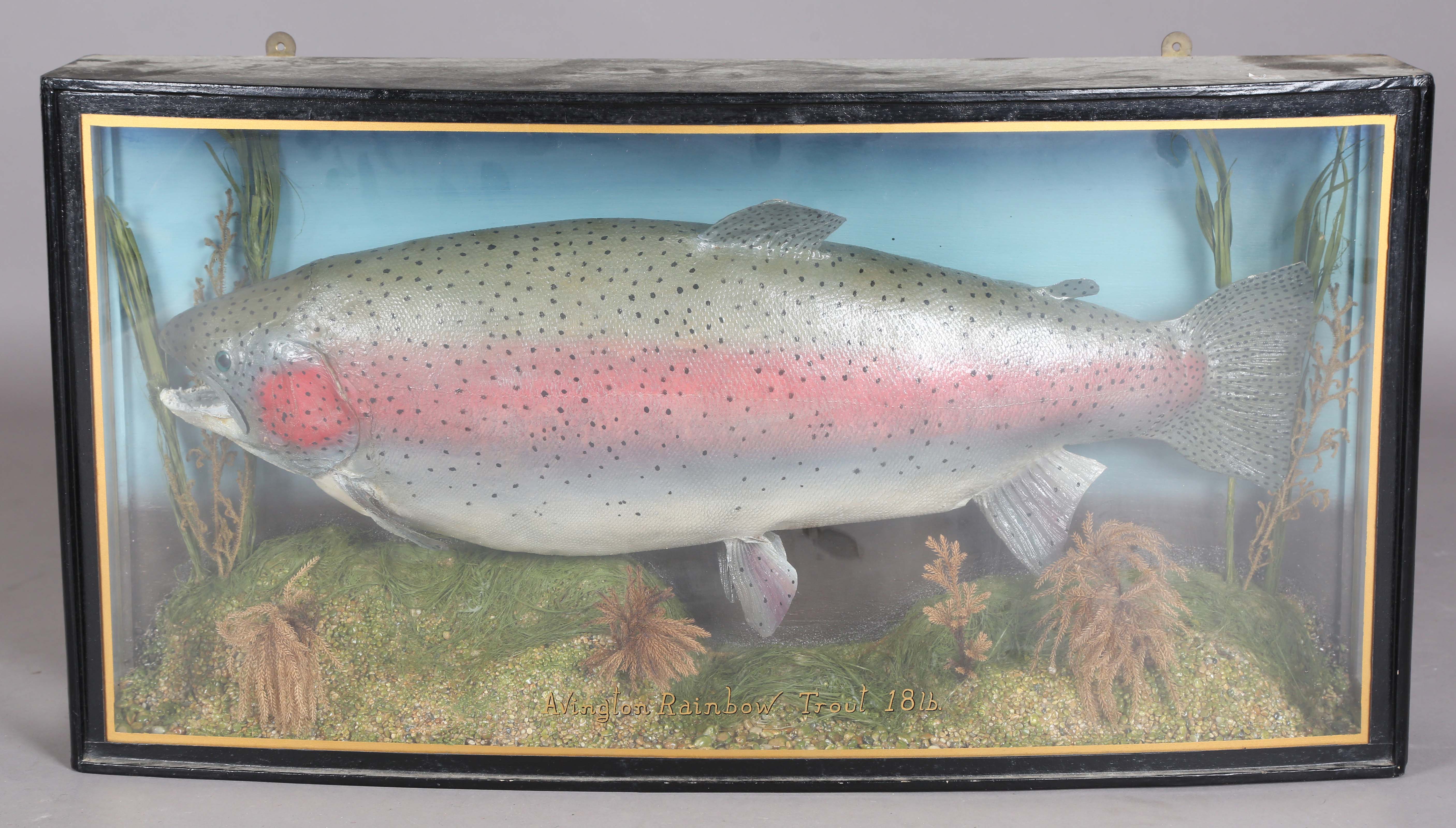 A late 20th century taxidermy specimen of a rainbow trout, the stuffed fish mounted within a glazed bowfront case, inscribed in gilt 'Avington Rainbow Trout 18lb', the interior bearing label inscribed 'Peter Stone Fish Taxidermist', height 42m, width 81cm.