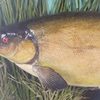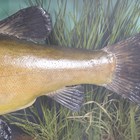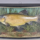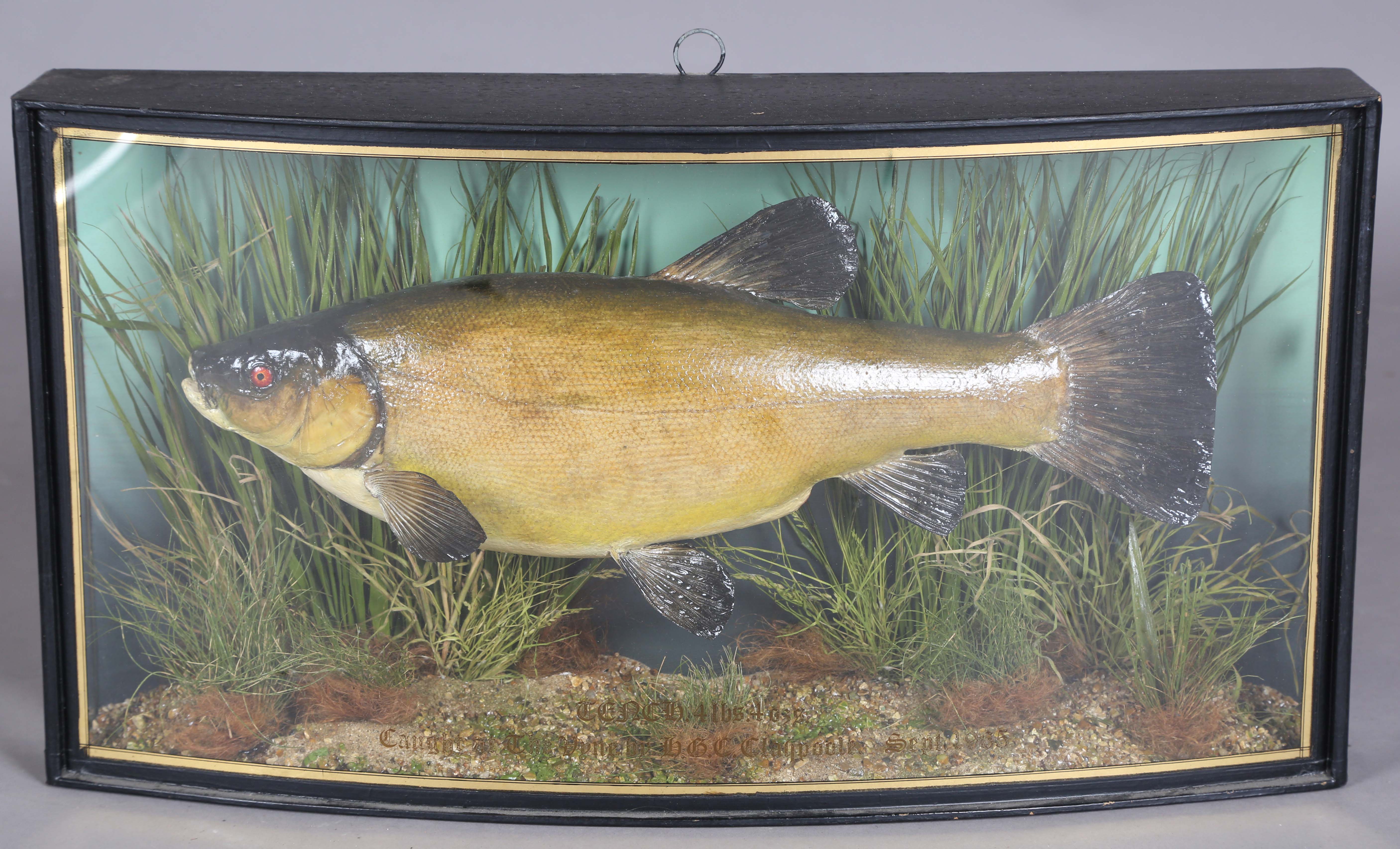 A mid-20th century taxidermy specimen of a tench preserved by J. Cooper & Sons, the stuffed fish mounted within a glazed bowfront case, the front inscribed in gilt 'Tench 4lbs. 4ozs. Caught at the Vyne by H.G.C. Claypoole. Sept 1965', and with applied label, detailed 'Preserved by J. Cooper & Sons 78 Bath Road... ', height 31cm, width 59cm.