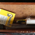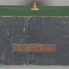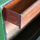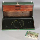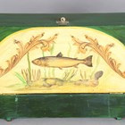 A modern green painted wooden fishing tackle box, the fall front decorated with a fish, the interior fitted with two drawers, height 49cm, width 75.5cm.