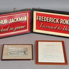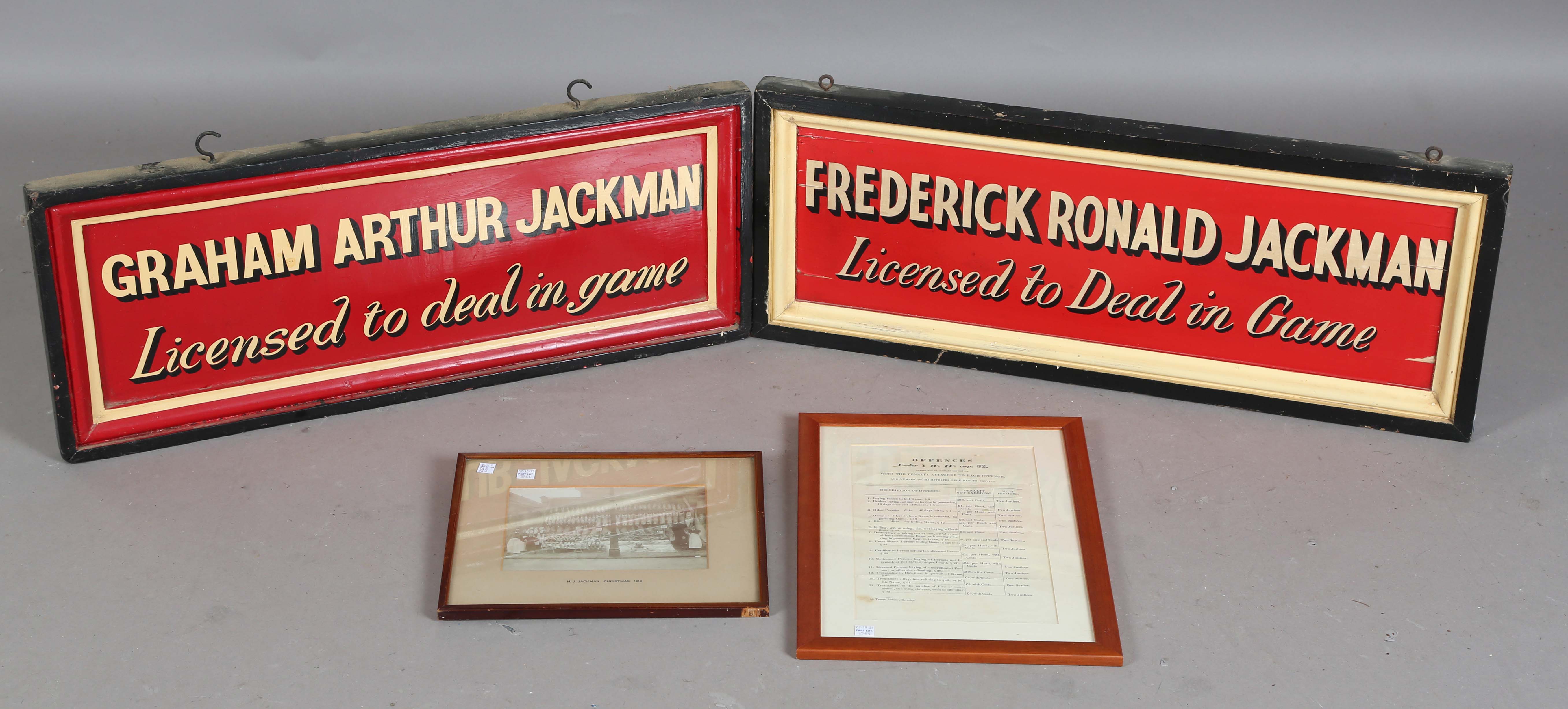 A hand painted signwritten advertising sign, inscribed 'Frederick Ronald Jackman Licensed to Deal in Game', 31cm x 79cm, together with another similar sign, a related photograph and 'Offences' list.