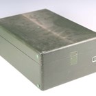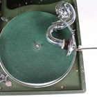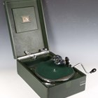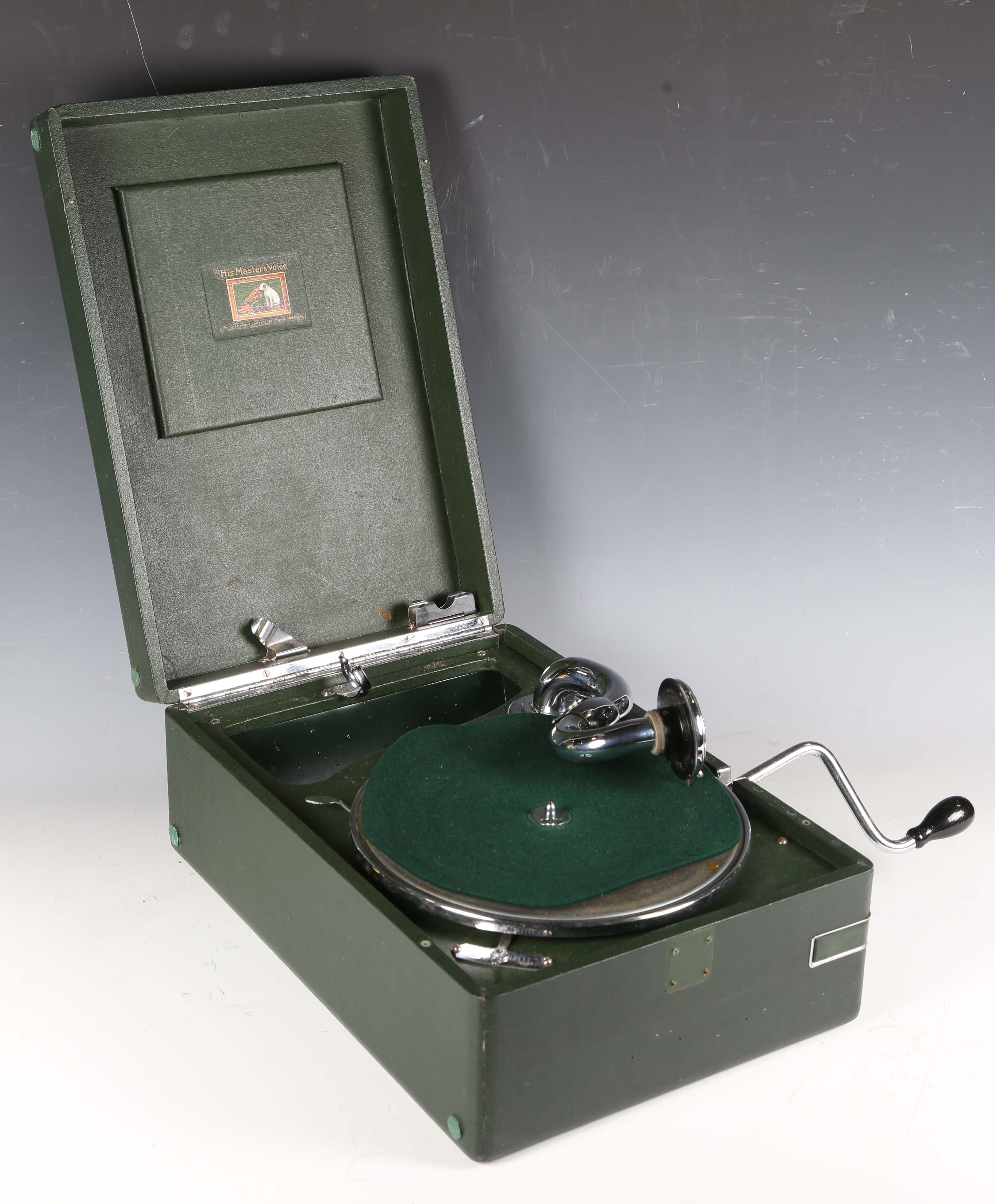 An HMV green cased mechanical gramophone, fitted with an HMV 5B soundbox, length 41.5cm (some parts detached).