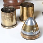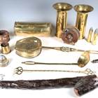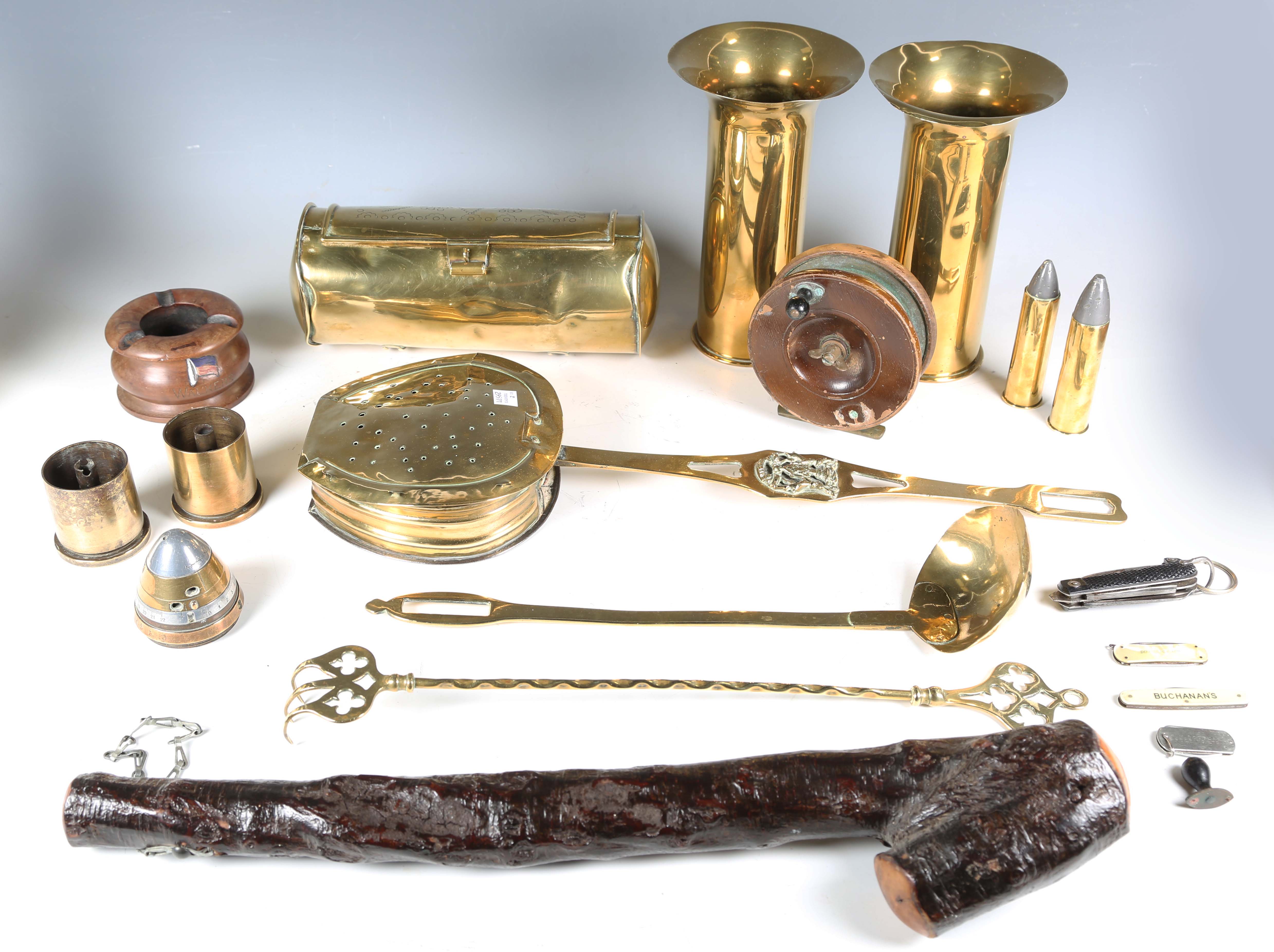 A mixed group of collectors' items, including an Irish yew shillelagh, length 55cm, an 18th century Dutch brass candlebox and various trench art.