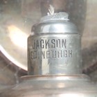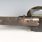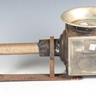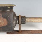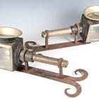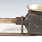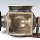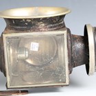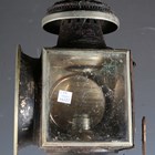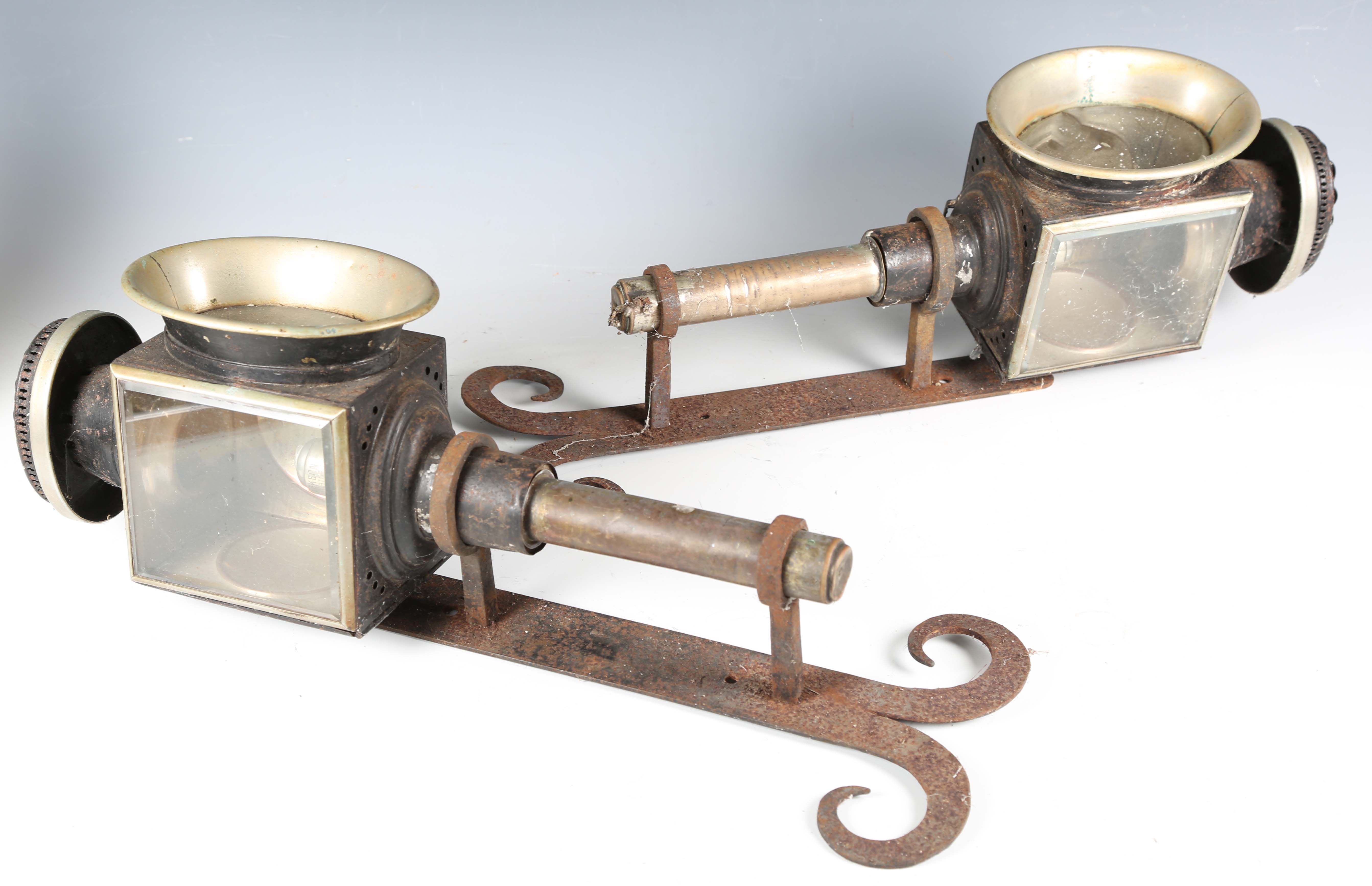 A pair of 19th century black tin and nickel mounted coaching lamps, mounted on later wrought iron wall brackets, height of brackets 55cm.