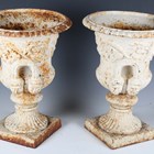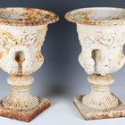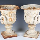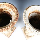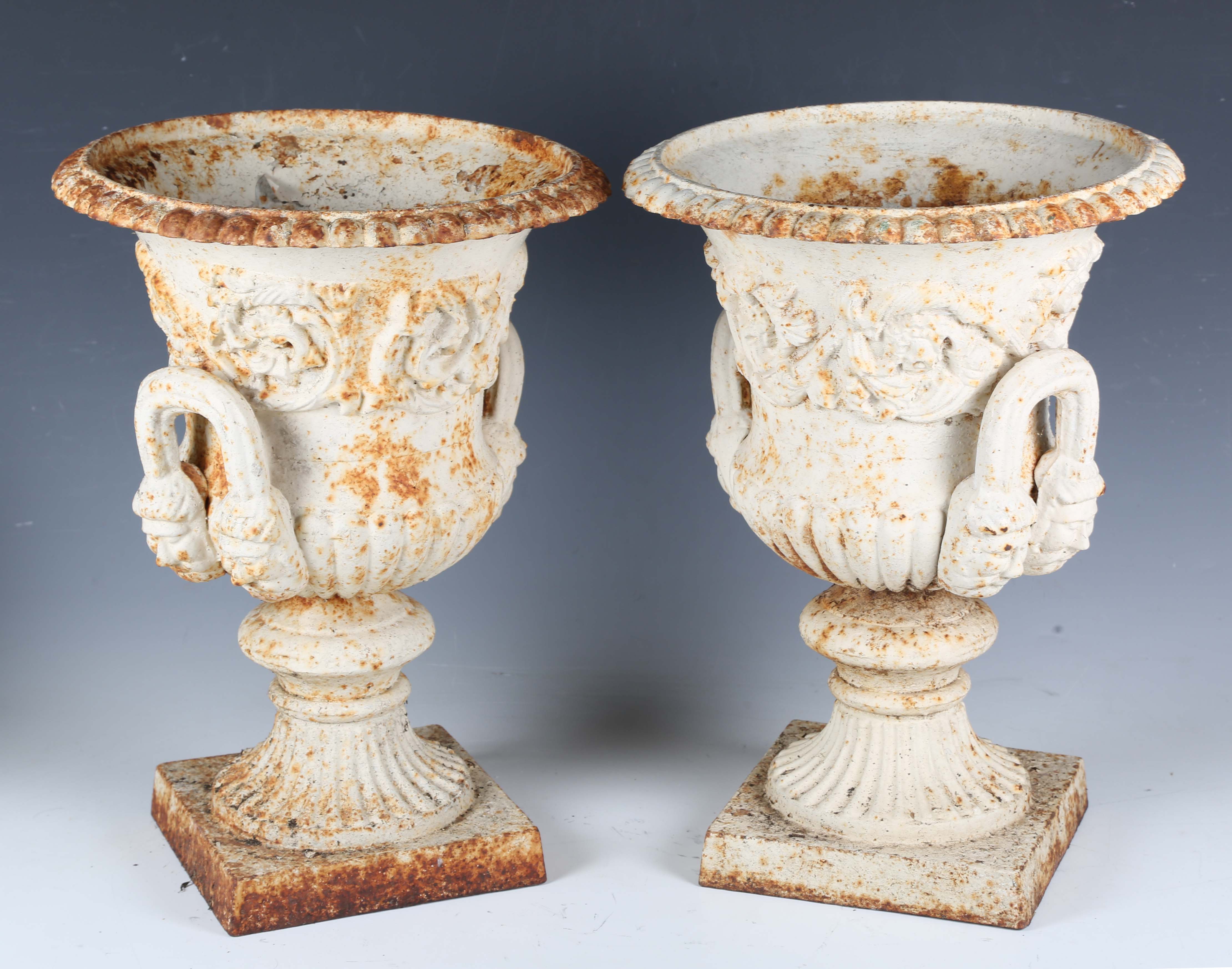 A pair of white painted cast iron garden urns of campana twin-handled form, height 37cm.