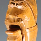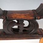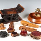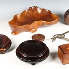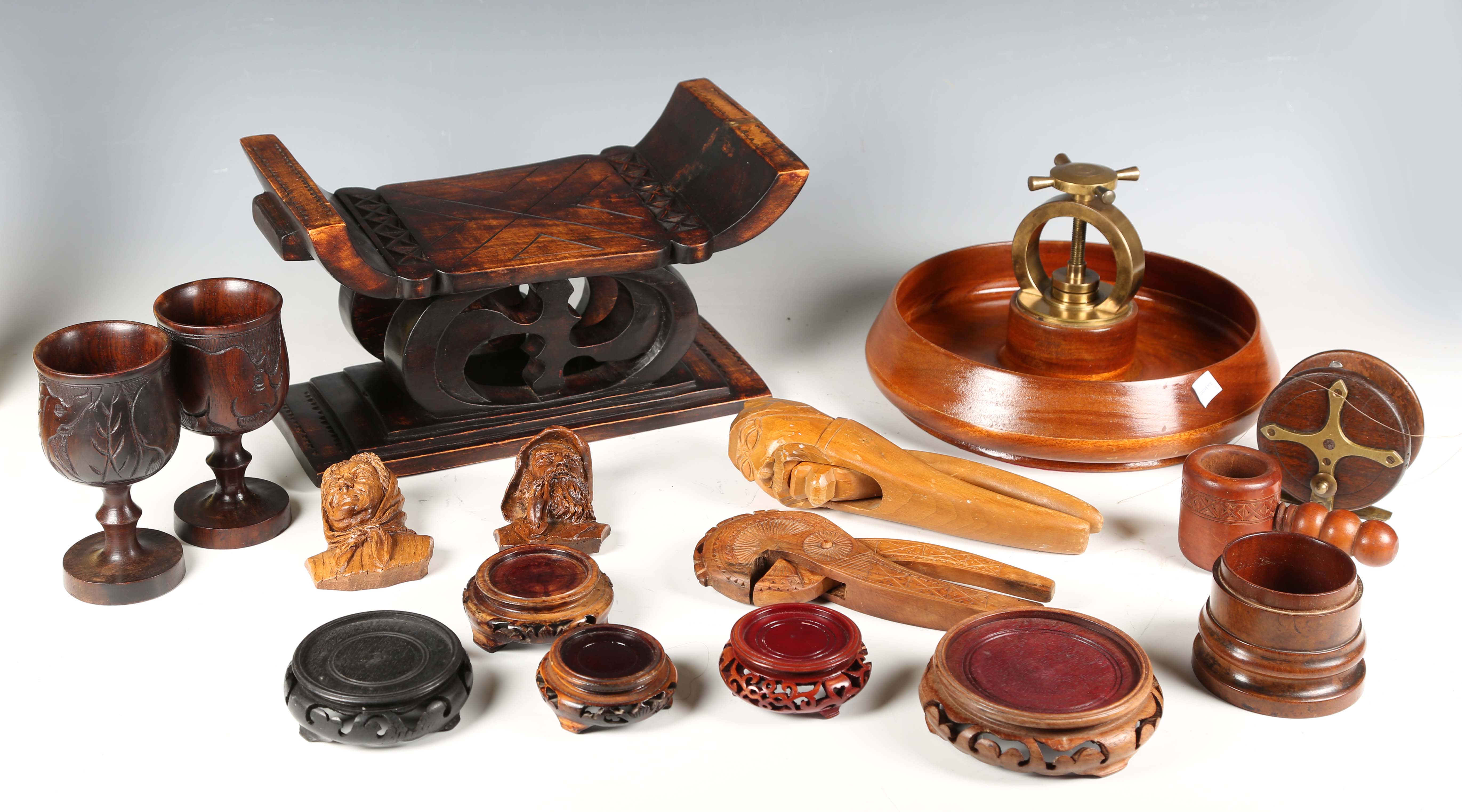 A group of mainly 20th century treen collectors' items and objects, including an Ashante style stool, width 34cm, various nutcrackers, goblets and stands.