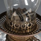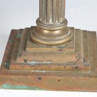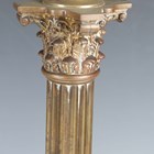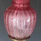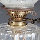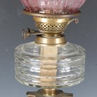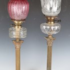 A late Victorian cut glass and brass Corinthian column table oil lamp by Messenger, fitted with an acid etched shade, height 70cm, together with another similar oil lamp with cranberry glass shade, height 74cm.