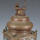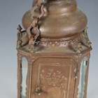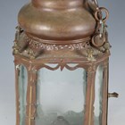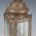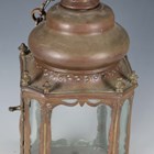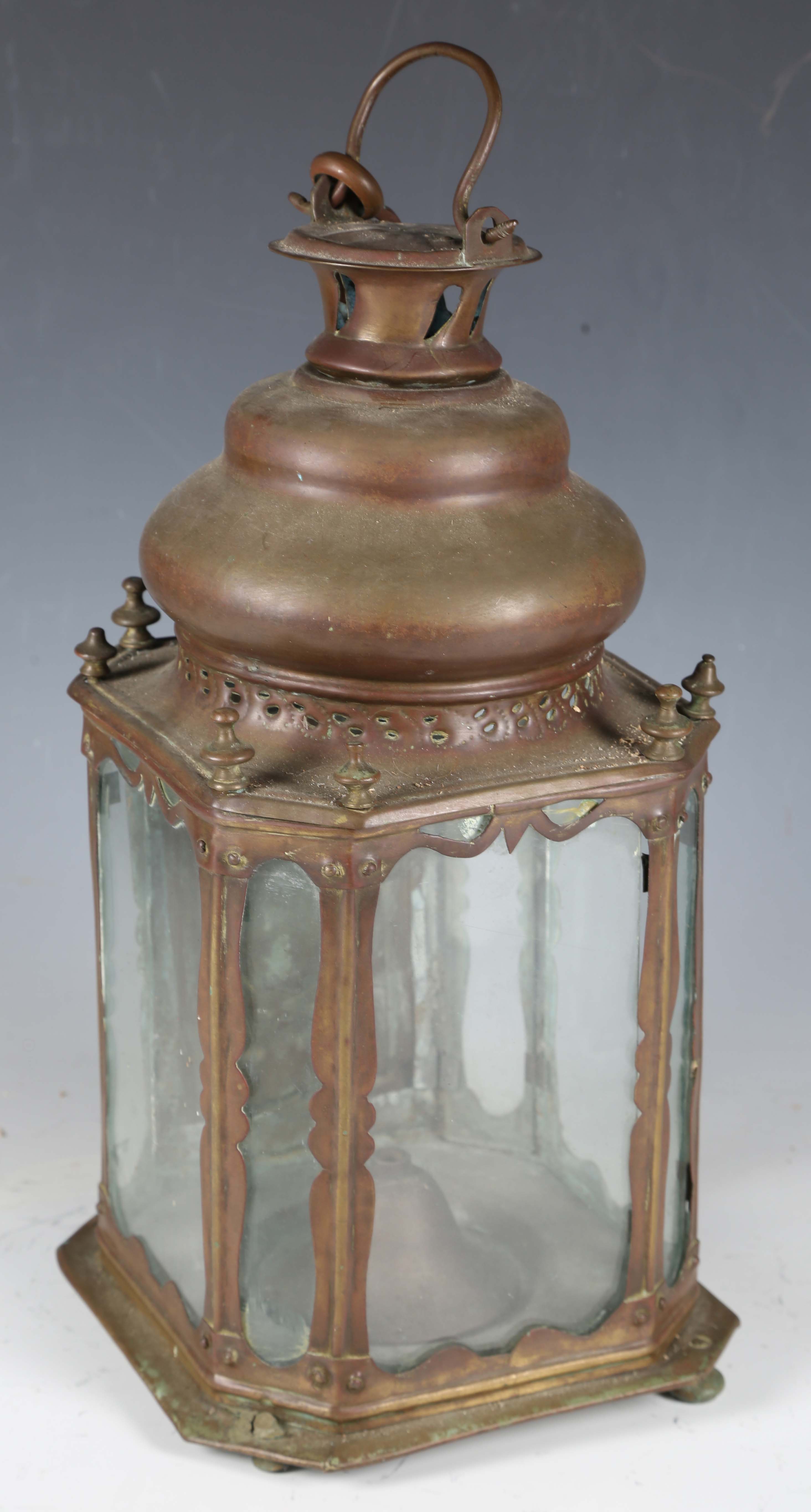 An 18th/19th century Continental patinated brass hanging lantern with domed top and glass sides, height 43cm.