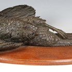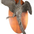 A late 20th century brown patinated cast metal model of a hung pheasant, after the original by Pierre Jules Mene, length 65cm, mounted on a wooden plaque.