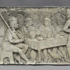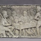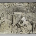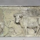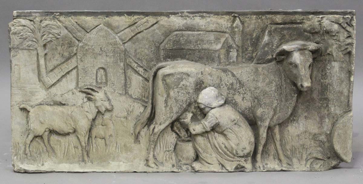 An early 20th century Neoclassical Revival sectional five-piece cast composition architectural building frieze, incorporating the number '1043' and moulded in relief with farm workers and animals, height 44cm, overall width 515cm (faults).