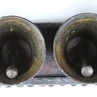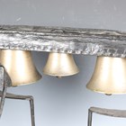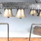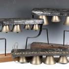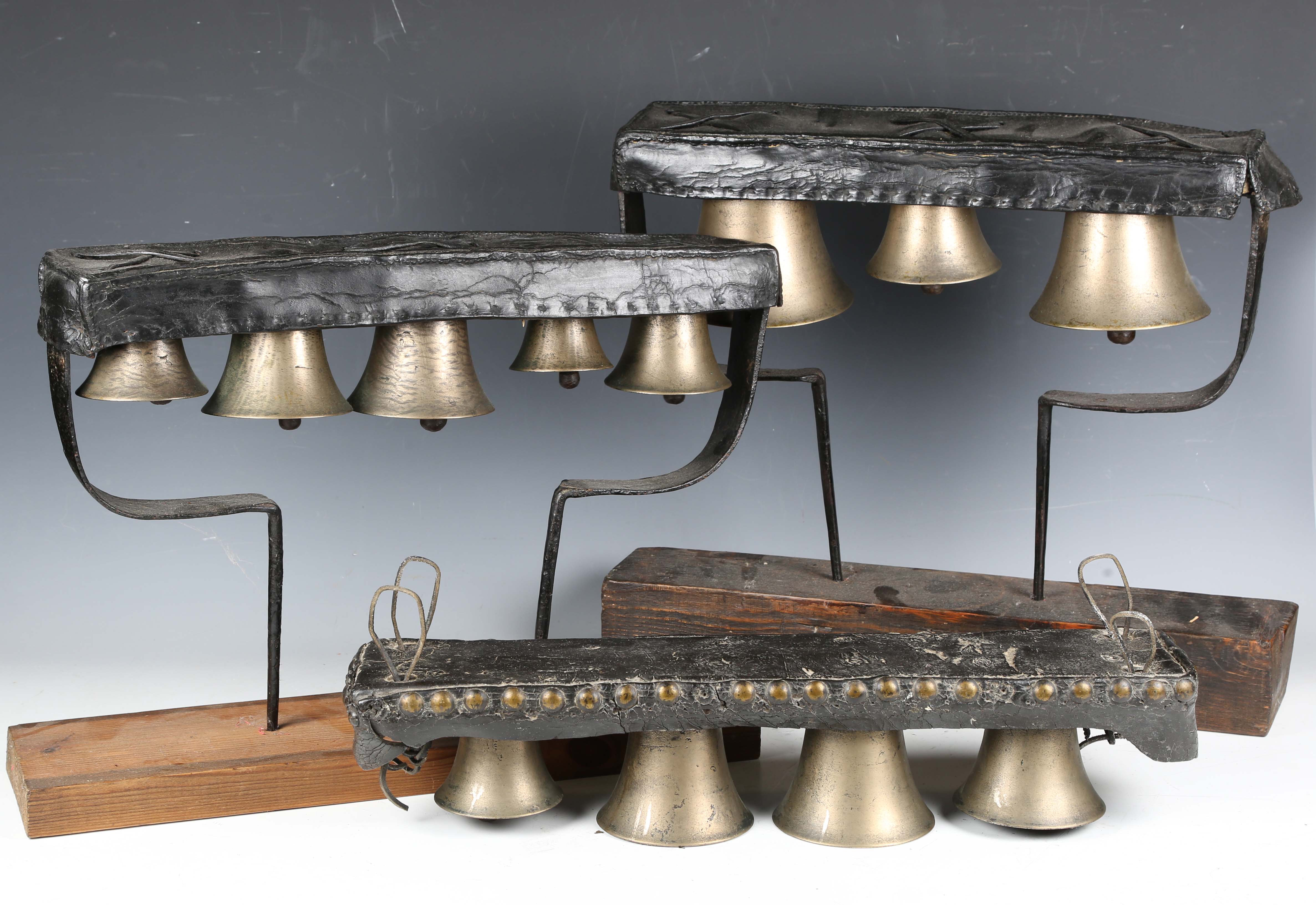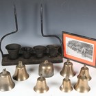 Four sets of late 18th/early 19th century heavy horse bells with spike mounts and leather pelmets, together with a group of seven other bells, some bearing Robert Wells of Aldbourne initials.