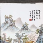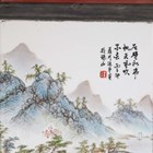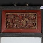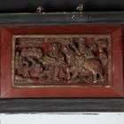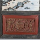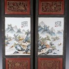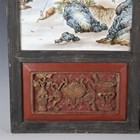 A pair of 20th century Chinese porcelain wall plaques, mounted within carved wooden panels, height 74cm, width 29cm.