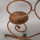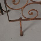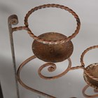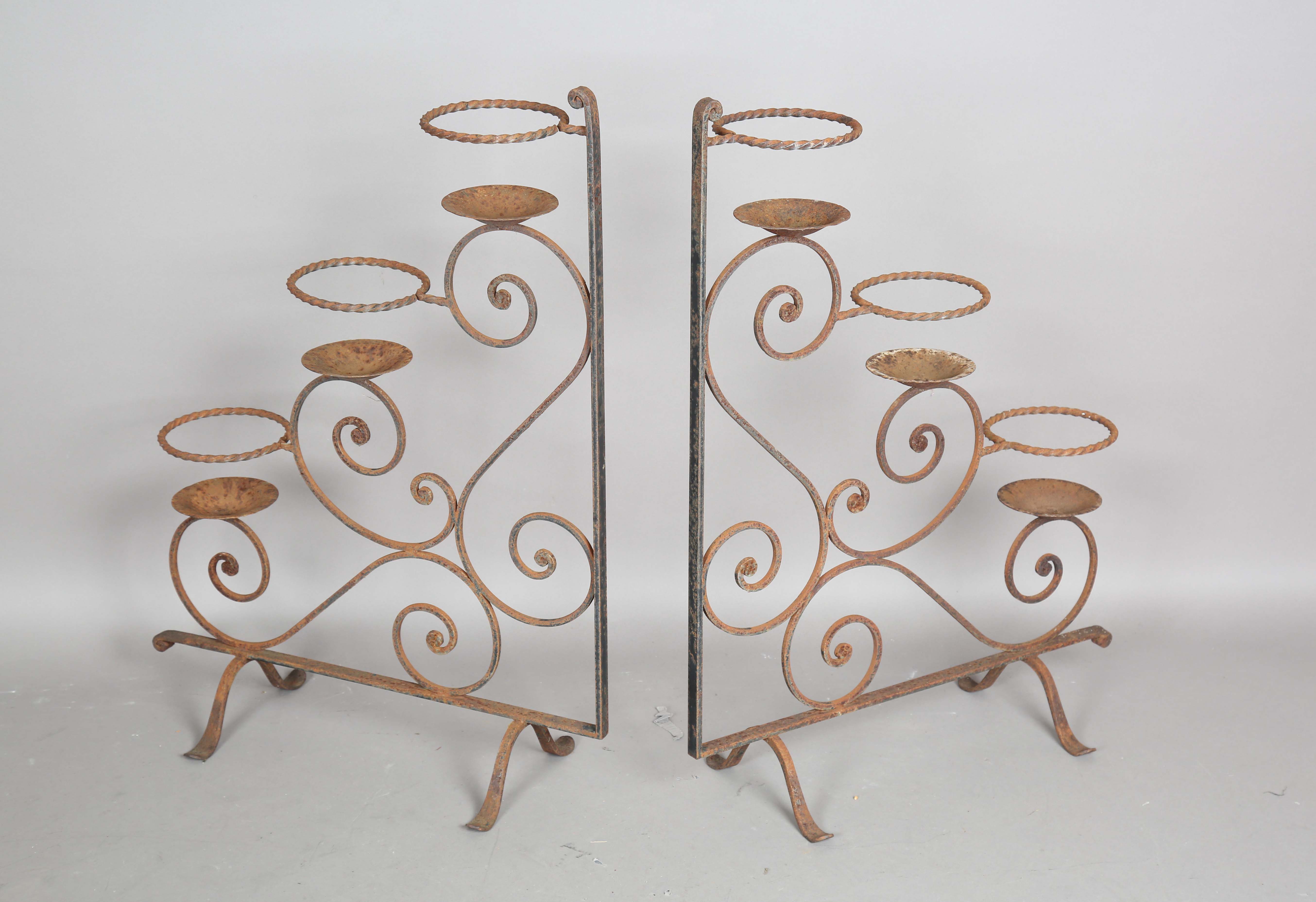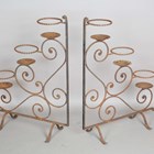A pair of 20th century French wrought iron three-tier garden plant pot stands, height 90cm, length 70cm.