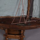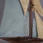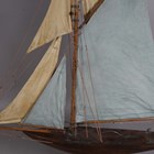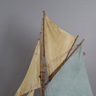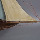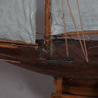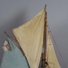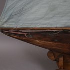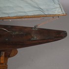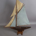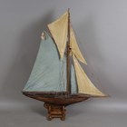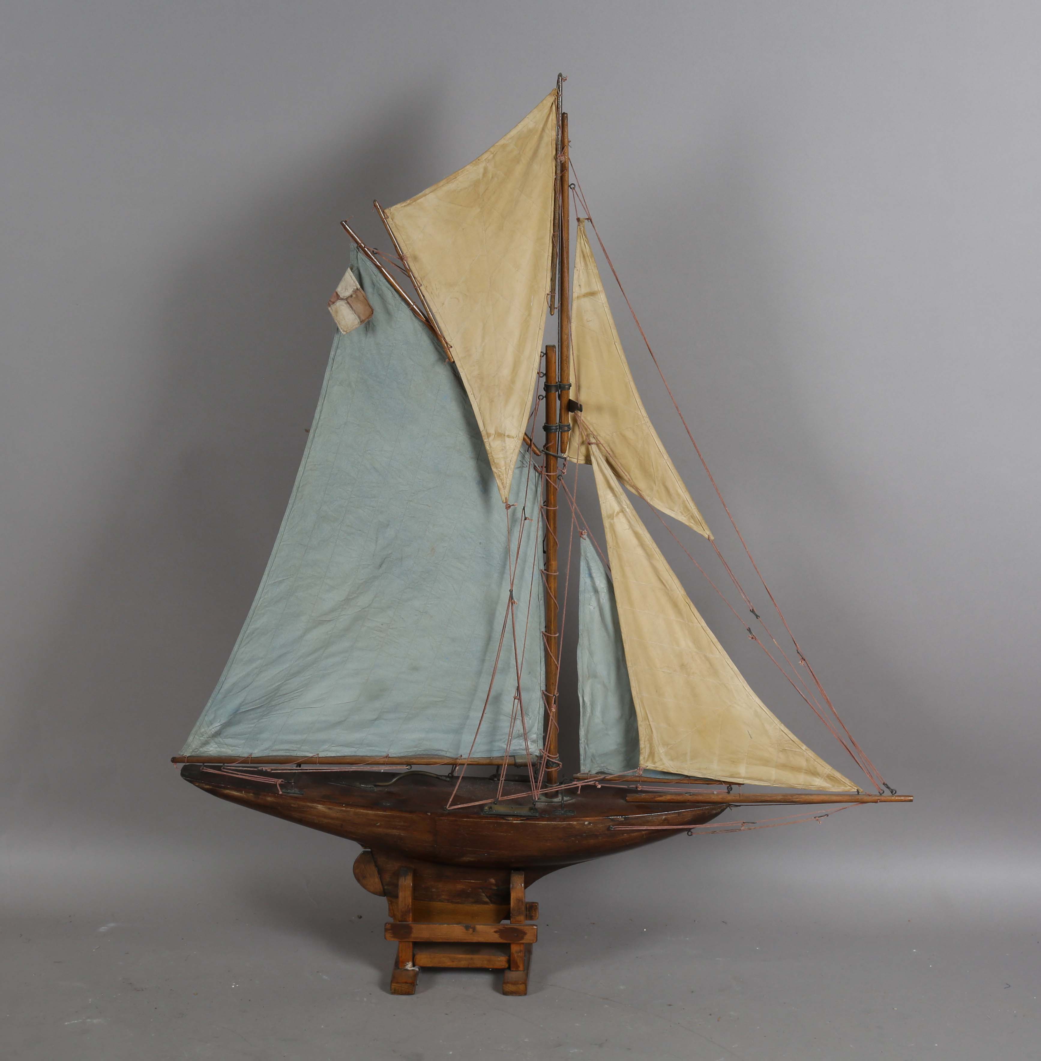 An early 20th century wooden pond yacht, rigged with cloth sails and supported on a display stand, length 101cm.