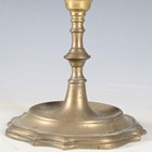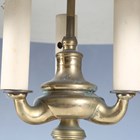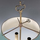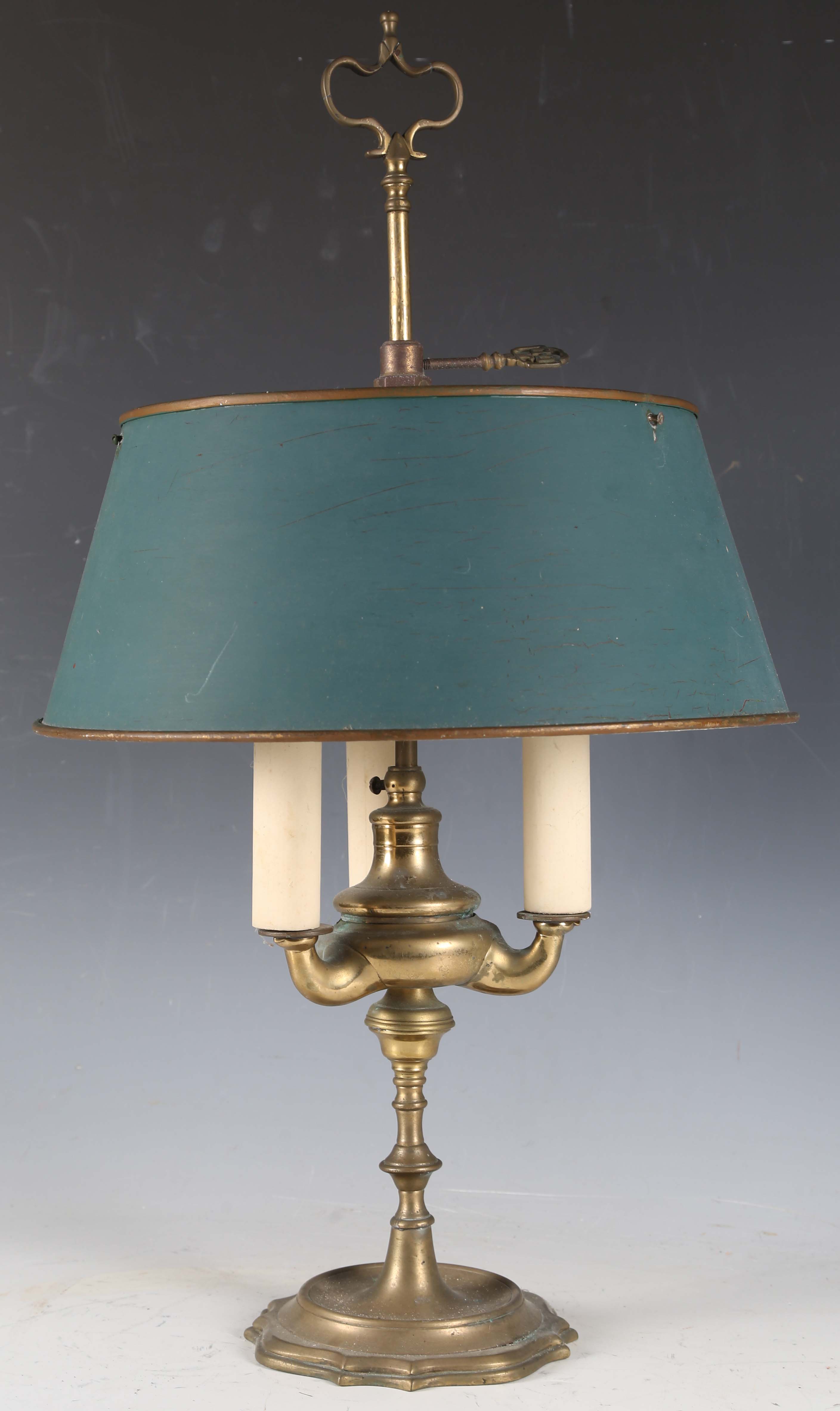 A 20th century brass three-branch student's lamp, fitted with an adjustable green tin shade, height 57.5cm.