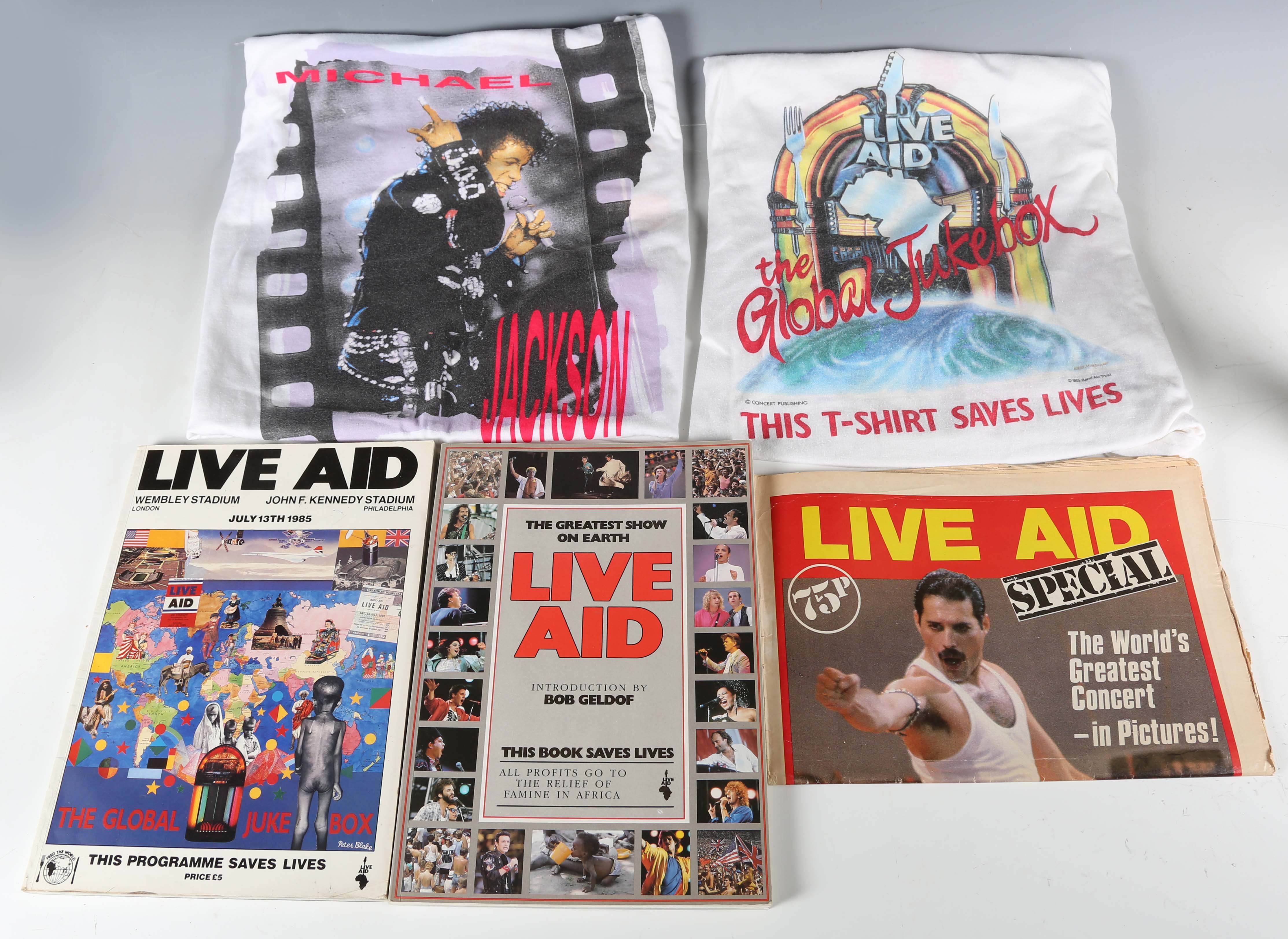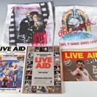A group of Live Aid memorabilia, including the original 1985 programme, a T-shirt, another brochure and a 1988 Michael Jackson tour t-shirt.
