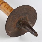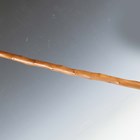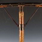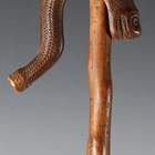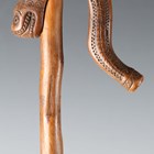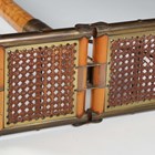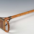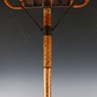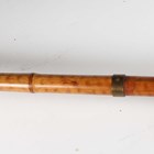 An early 20th century bamboo and brass mounted shooting stick, the folding seat with caned panels, length 75cm, together with a long walking staff with finely modelled handle, length 160cm.