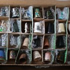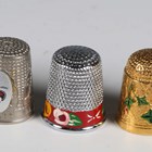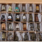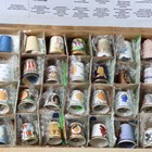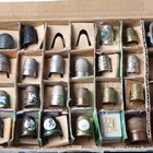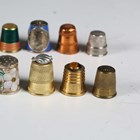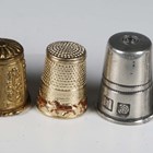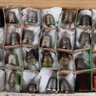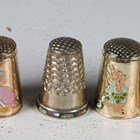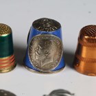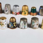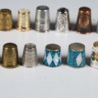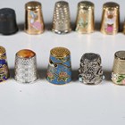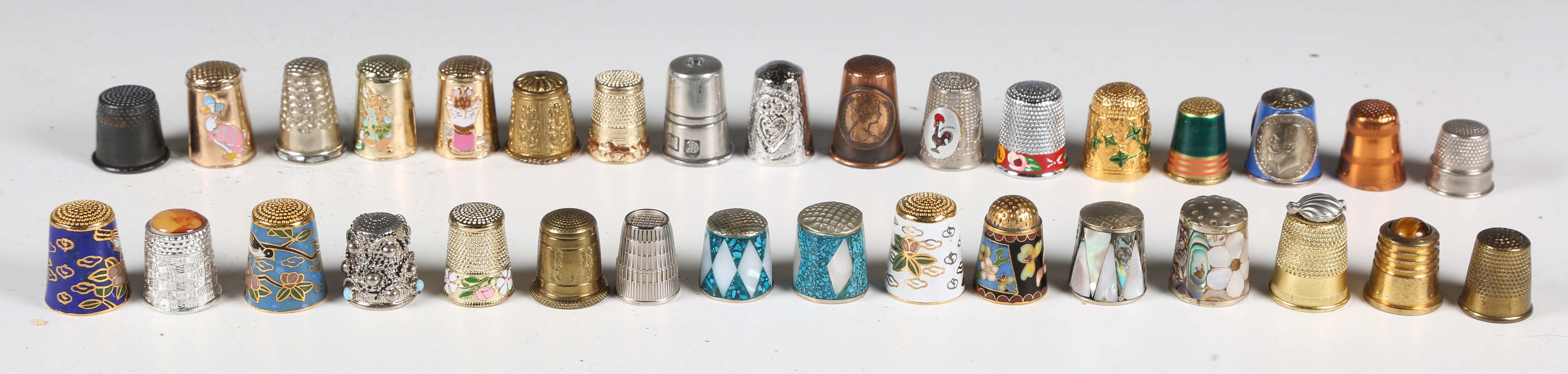 A large collection of thimbles, including silver, aluminium advertising modern porcelain, cloisonné and other examples.