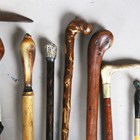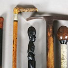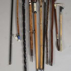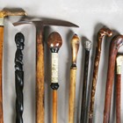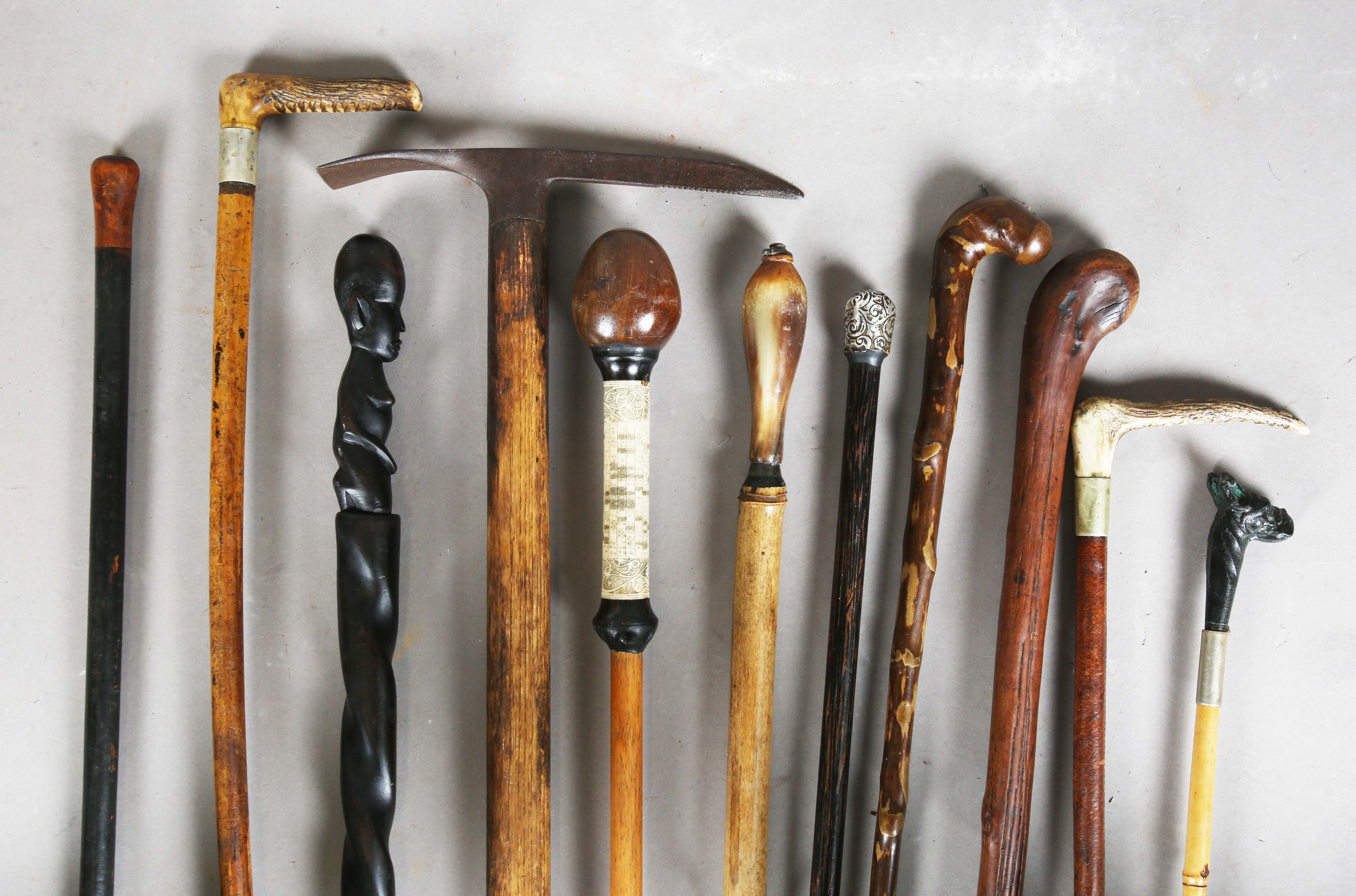 A mixed group of seven walking sticks, one with incised bone collar, together with three riding crops and an ice pick, length 86cm.