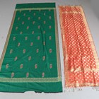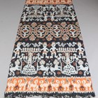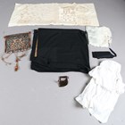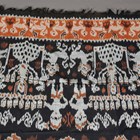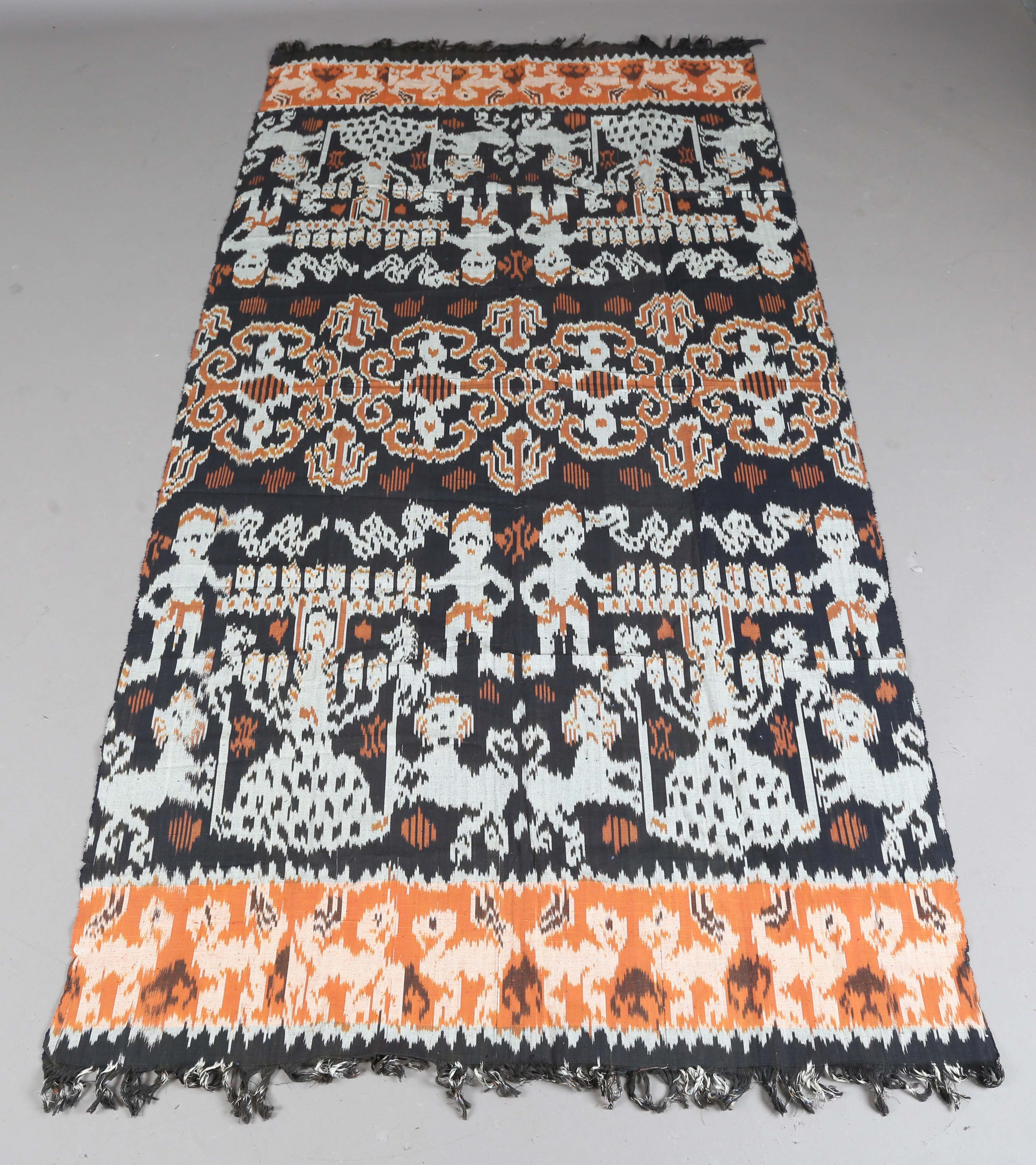 An Indonesian ikat panel, designed with bands of figures and animals, 234cm x 114cm, together with an Indian green cotton shawl, an Indian red silk and gilt thread shawl, a Persian woven bag, a purple velvet and gilt thread panel, a Victorian woven silk and embroidered border and a small group of other textiles.
