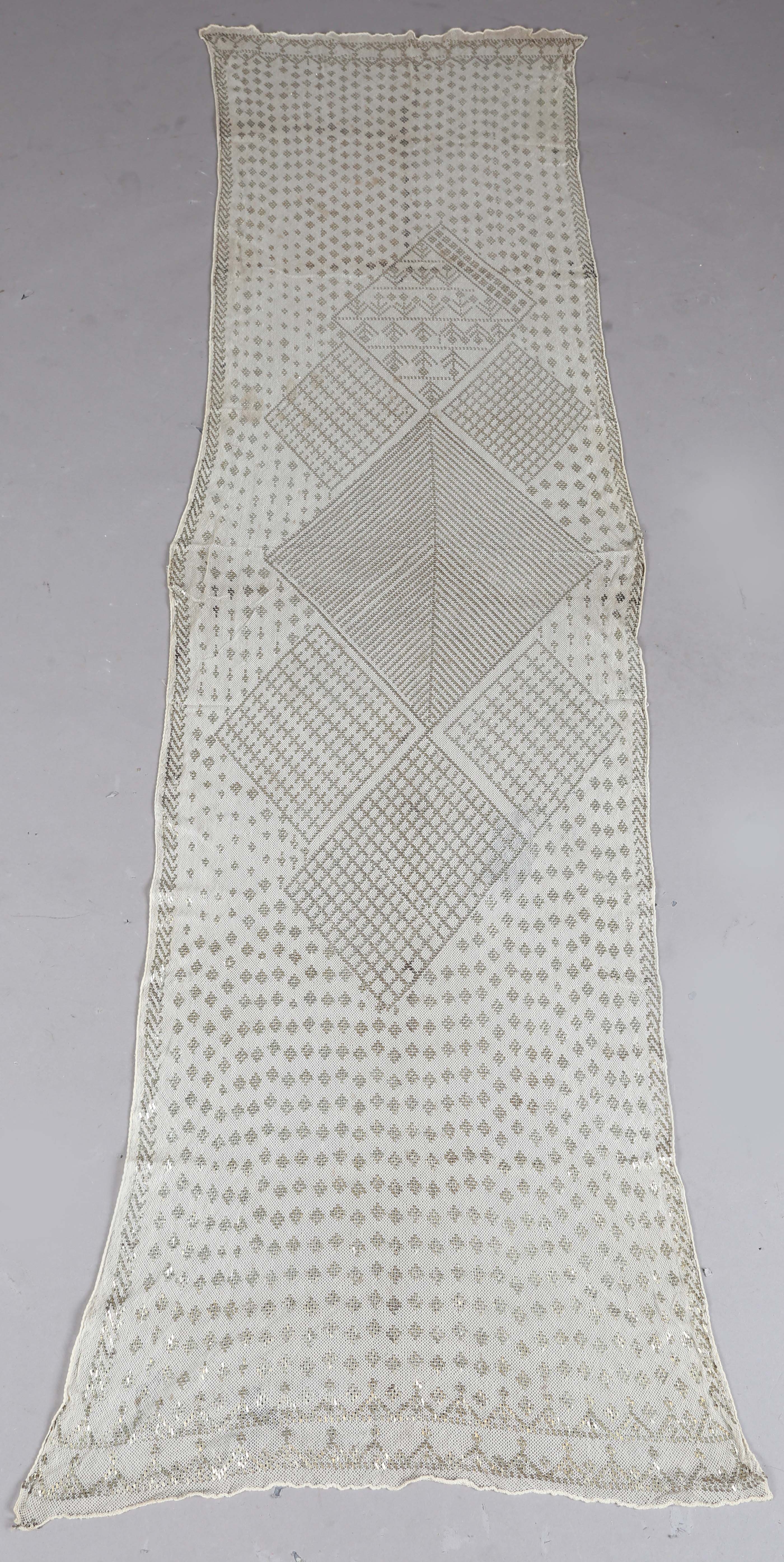 An Egyptian Art Deco Assuit shawl, worked with overall silver foil in geometric patterns, 206cm x 51cm.