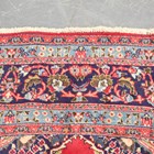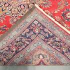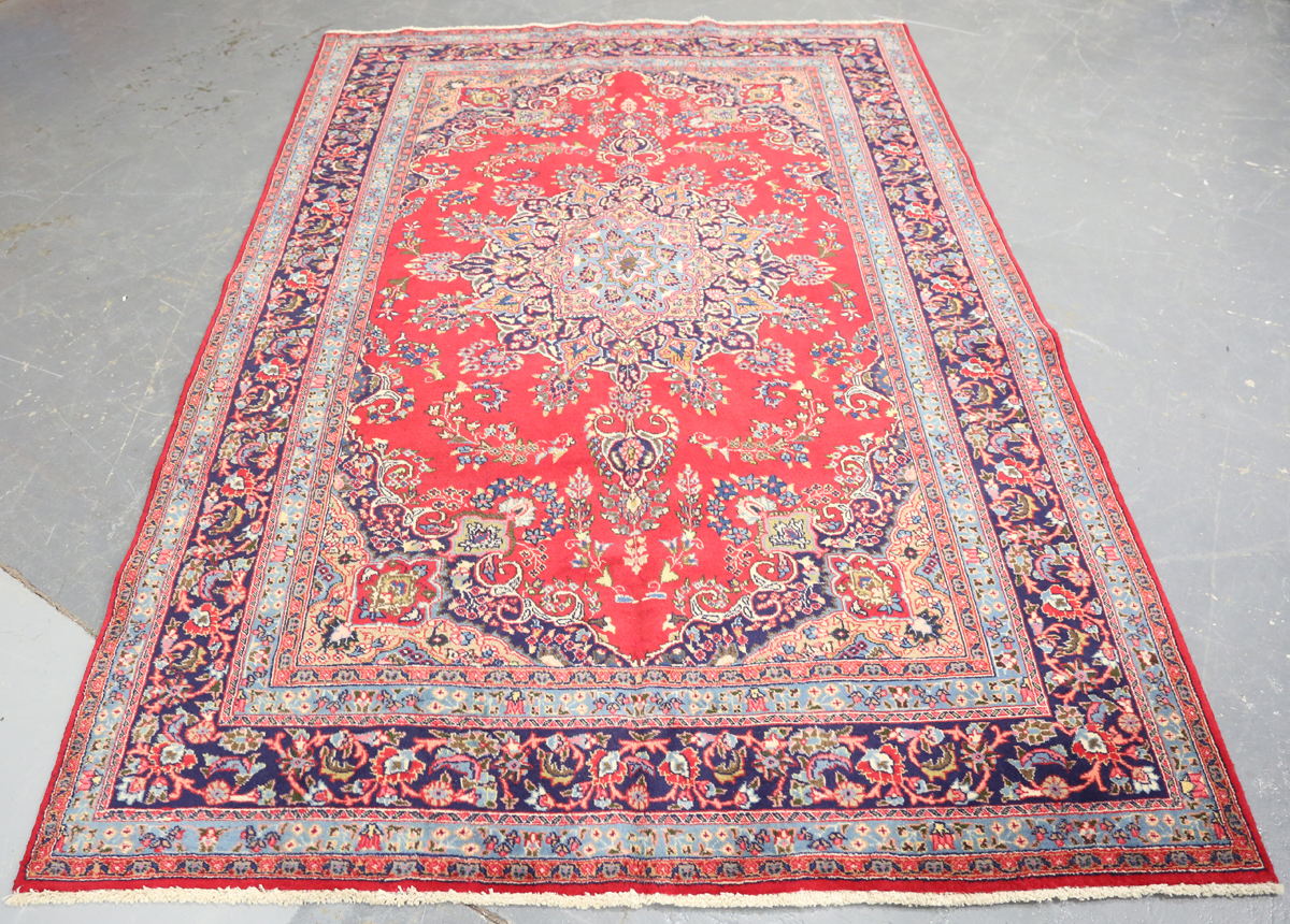 A Mashad carpet, Central Persia, late 20th century, the cherry red field with a circular medallion, within a blue flowering vine border, 275cm x 185cm.