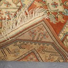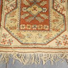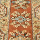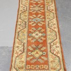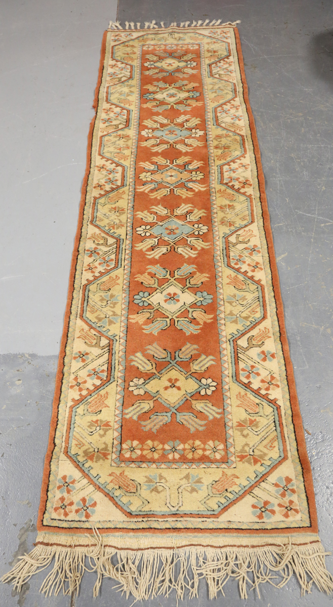 A Turkish runner, late 20th century, the terracotta field with a column of medallions, within an ivory border, 282cm x 80cm.