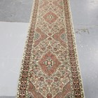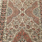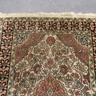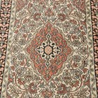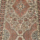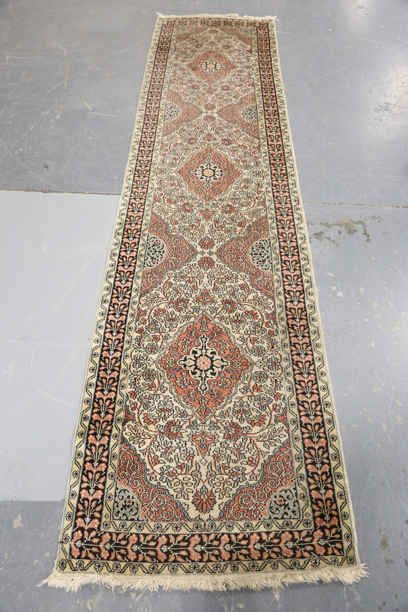 A Kashmir part silk runner, late 20th century, the ivory field with overall medallions and scrolling foliage, within a complimentary border, 335cm x 80cm.