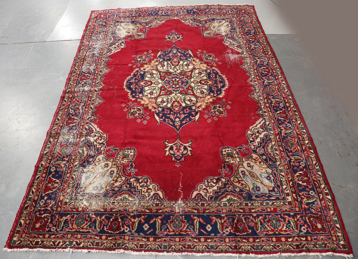 A Sparta carpet, West Anatolia, early 20th century, the claret field with a large medallion, within a blue cartouche border, 315cm x 220cm.