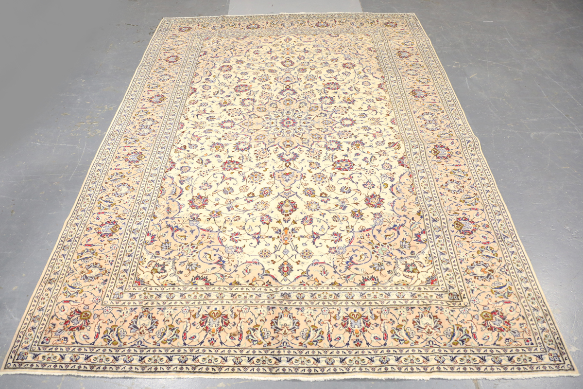 A Kashan carpet, Central Persia, late 20th century, the ivory field with a flowerhead medallion, supported by flowering stems, within a taupe complimentary border, 343cm x 246cm.
