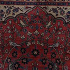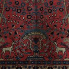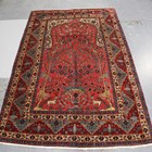 A Kerman prayer rug, Central Persia, early/mid-20th century, the pink mihrab with ascending plants and trees, populated by birds and deer, within a claret and blue cypress tree border, 244cm x 165cm.