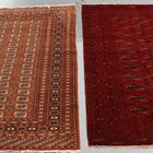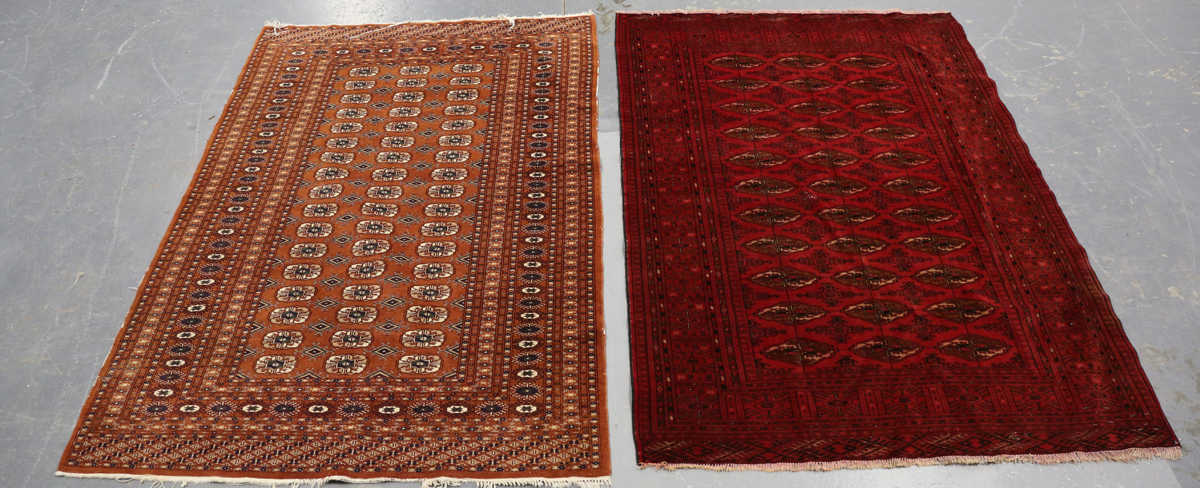 A Yomut rug, Turkestan, 20th century, the deep claret field with overall guls, 180cm x 127cm, together with a Pakistan bokhara rug, 182cm x 128cm.