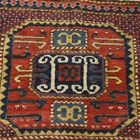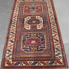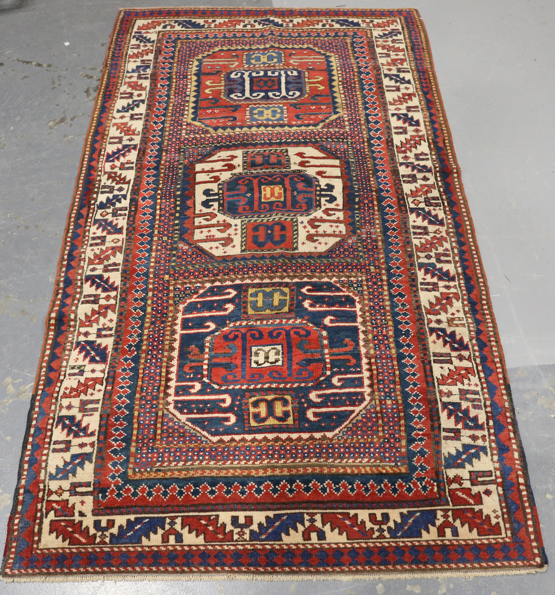 A Chajli rug, South-west Caucasus, early 20th century, the polychrome field with three bold medallions, within an ivory serrated leaf border, 212cm x 122cm.