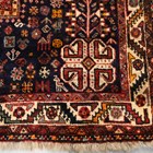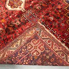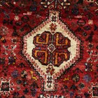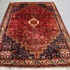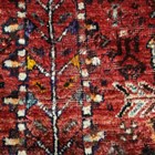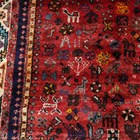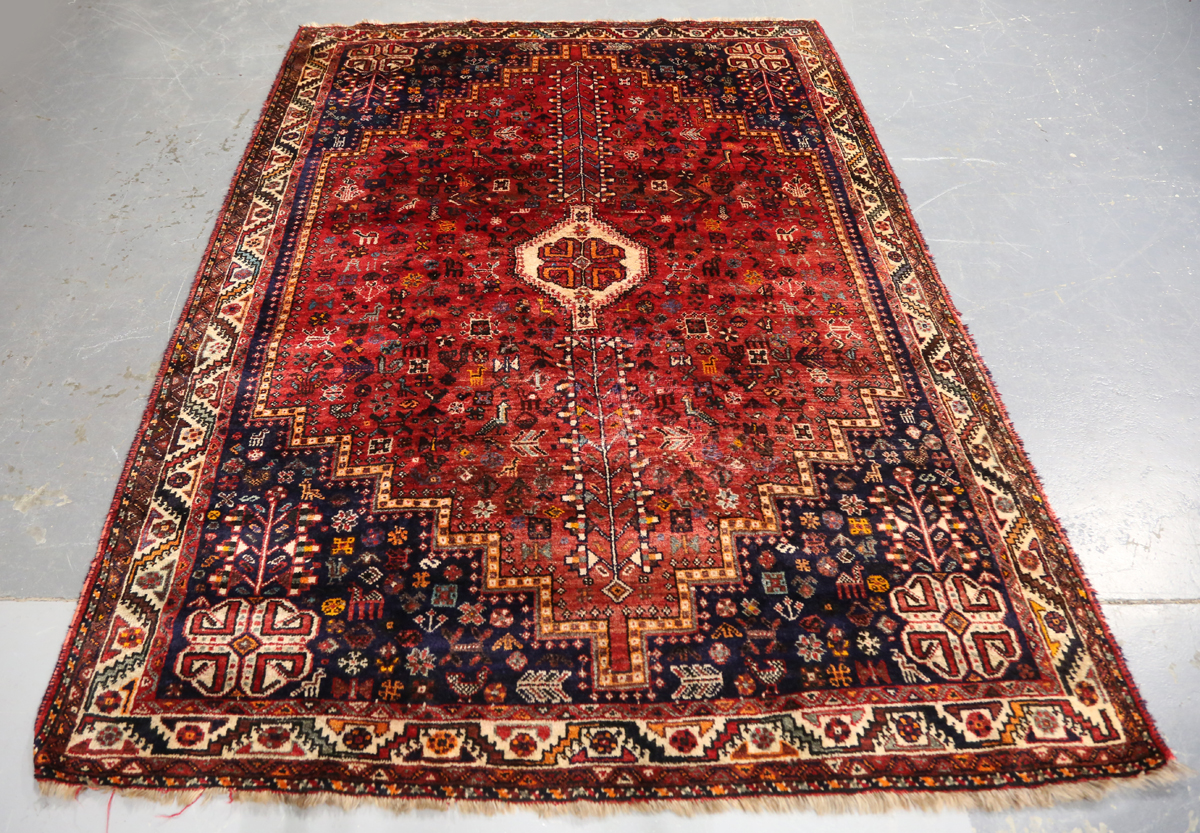 A Shiraz carpet, South-west Persia, the red field with a small ivory medallion, within an ivory continuous vine border, 304cm x 215cm.