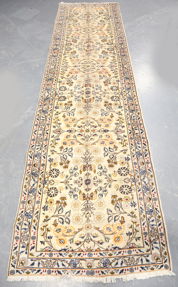 A Kashan runner, Central Persia, late 20th century, the ivory field with overall flowering stems, within a complimentary border, 407cm x 109cm.