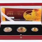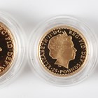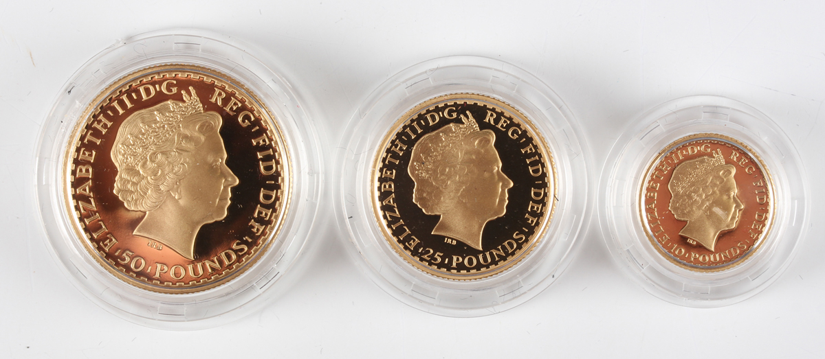 A scarce Elizabeth II Royal Mint gold proof Britannia three-coin set 2005, comprising fifty pounds, twenty-five pounds and ten pounds, deluxe-cased with certificate, No. 103.