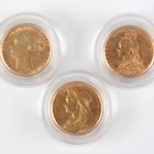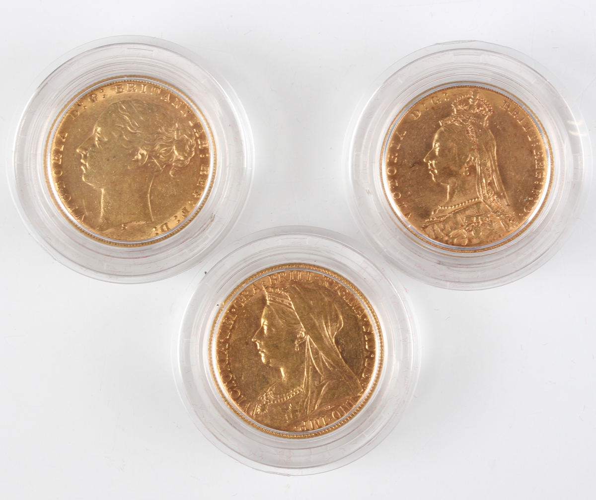 A Royal Mint Her Majesty Queen Victoria Sovereign Portrait Collection sovereign three-coin set, comprising Young Head 1876, Sydney Mint, Jubilee Head 1892, Melbourne Mint, and Veiled Head 1898, Melbourne Mint, deluxe-cased with certificate, No. 0093.