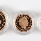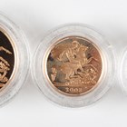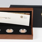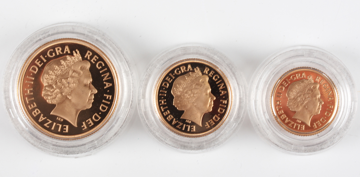 An Elizabeth II Royal Mint Gold Proof Sovereign three-coin set 2008, comprising two pounds, sovereign and half-sovereign, deluxe-cased with certificate, No. 206.