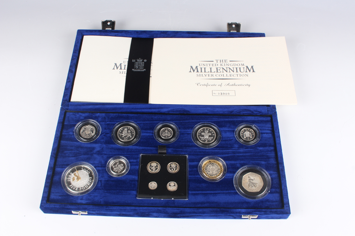 An Elizabeth II Royal Mint United Kingdom Millennium Silver Collection silver proof thirteen-coin set 2000, deluxe-cased with certificate, No. 03900.