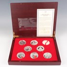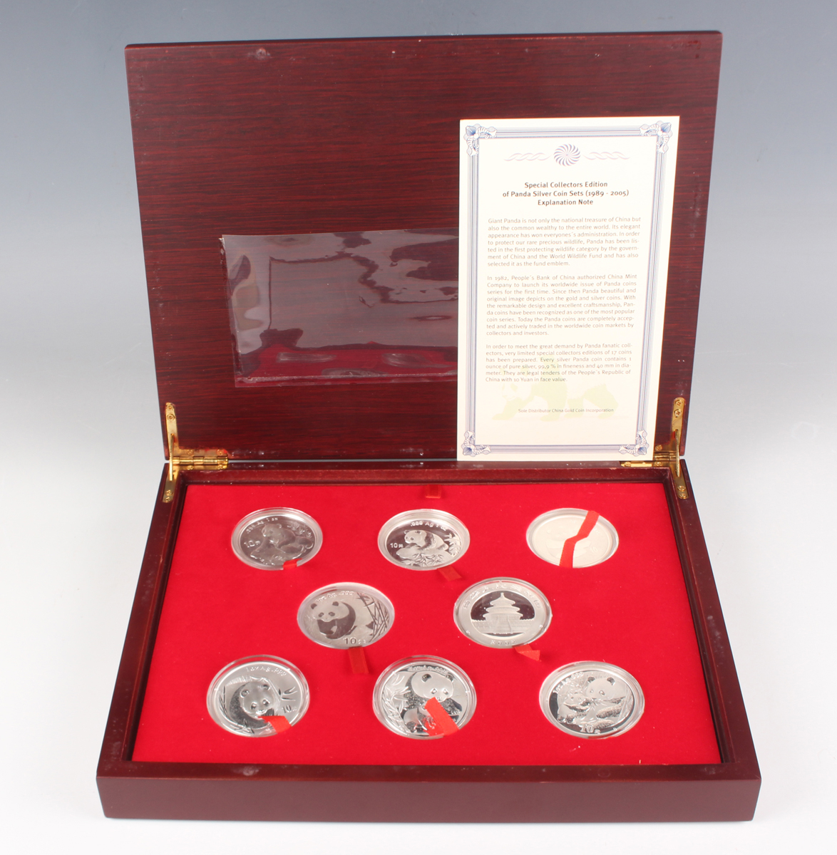 A China Gold Coin Incorporation People's Bank of China one-ounce silver Panda seventeen-coin set 1989-2005, deluxe-cased with certificate.