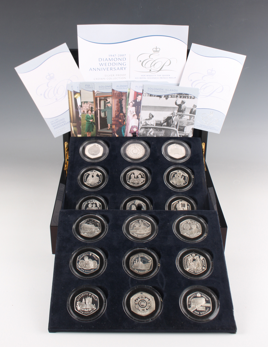 An Elizabeth II Royal Mint silver proof crown-size eighteen-coin set 2007 celebrating the Diamond Wedding Anniversary of Her Majesty The Queen and His Royal Highness Prince Philip, deluxe-cased with certificate and associated paperwork.