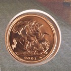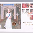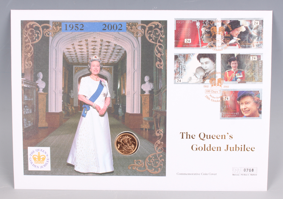 A Westminster Mint coin cover celebrating the Queen's Golden Jubilee, with Elizabeth II sovereign 2001, edition No. 0768.
