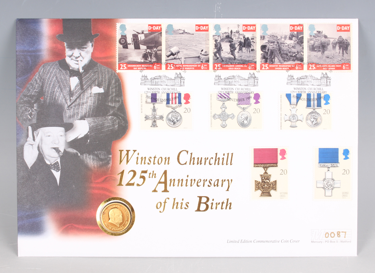 A Westminster Mint coin cover commemorating the 125th Anniversary of the birth of Winston Churchill 1814-1965, with Elizabeth II Bailiwick of Guernsey twenty-five pounds 1999, edition No. 0087.