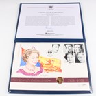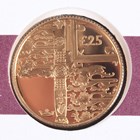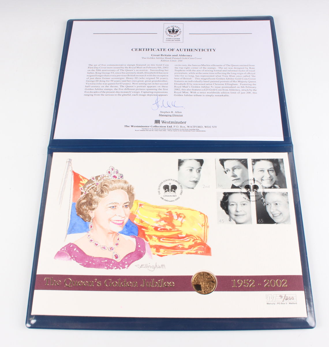 A Westminster Mint coin cover celebrating the Queen's Golden Jubilee, with Elizabeth II gold Alderney twenty-five pounds 2002, within a folder style display, the cover with hand-painted portrait of HM The Queen by Christine Ellingham, edition No. 9/200.