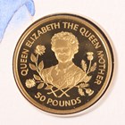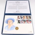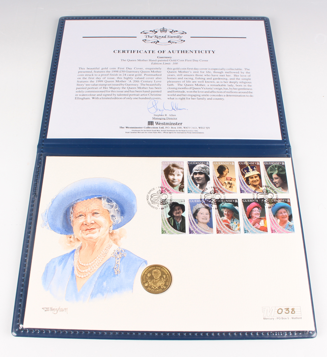 A Westminster Mint coin cover celebrating The Queen Mother, with Elizabeth II gold Bailiwick of Guernsey fifty pounds 1998, within a folder style display, the cover with hand-painted portrait of The Queen Mother by Christine Ellingham, edition No. 038.