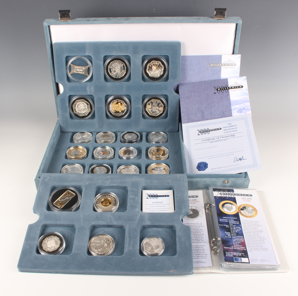 An incomplete Royal Mint Masterpiece Millennium Collection silver proof coin set 2000, comprising twenty-three coins in a variety of shapes and sizes (one coin missing), deluxe-cased with some paperwork (certificates missing).
