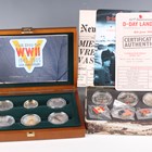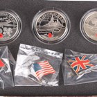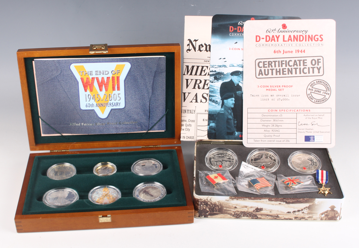 An Elizabeth II Royal Mint silver proof six-coin set 2005 commemorating the 60th Anniversary of the End of World War II, deluxe-cased with certificate, together with an Elizabeth II Royal Mint silver proof three-coin set 2004 commemorating the 60th Anniversary of the D-Day Landings, within a tin display box with certificates, paperwork and associated facsimile items.