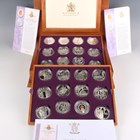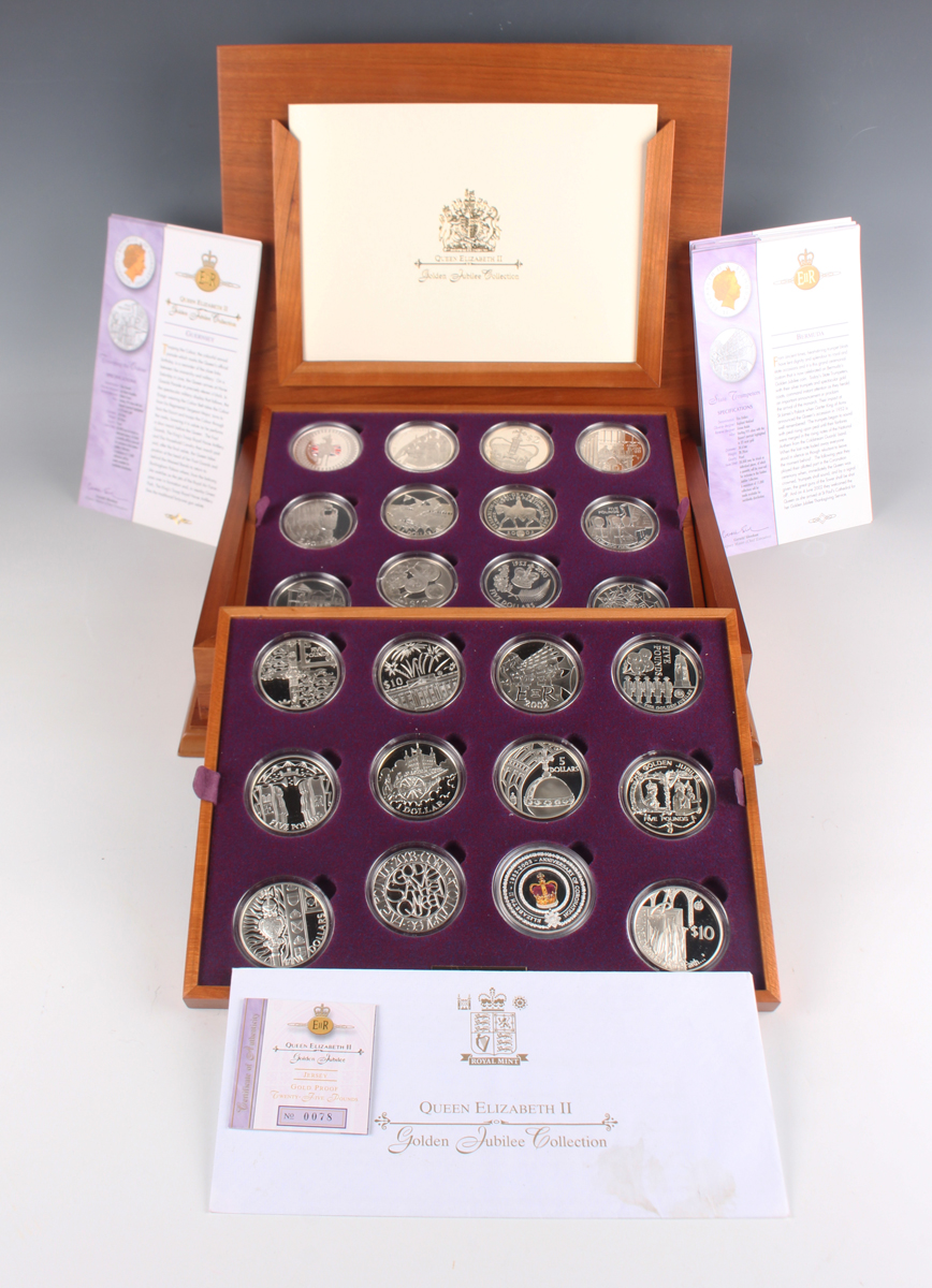 An Elizabeth II Royal Mint Golden Jubilee Collection silver proof crown-size twenty-four coin set 2002, within a deluxe wood-effect box with certificates and paperwork.