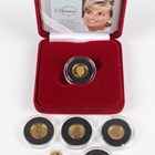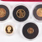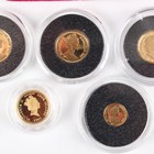 A small collection of Elizabeth II diminutive gold commemorative coins, comprising an Isle of Man angel 1994, a Gibraltar royal 1995, a Bailiwick of Guernsey five pounds 1998, a Cook Islands five dollars 1997, a Gibraltar one-gram coin 1993 and a Royal Mint Alderney one pound 2007, cased with certificate.