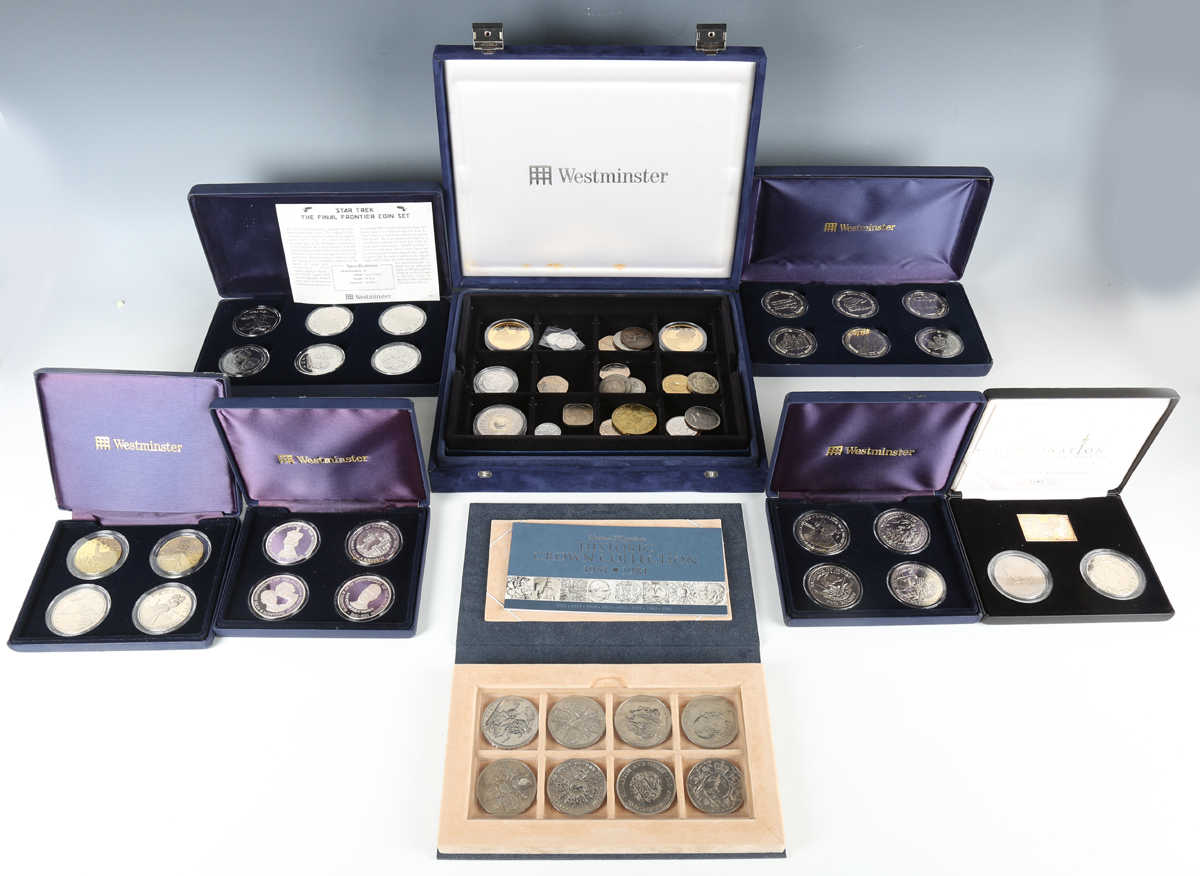 A large collection of mainly Westminster Mint base metal commemorative coins, including a large number celebrating royalty, some cased (some environmental damage).